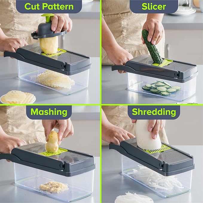 PICADOR Y CORTADOR DE VERDURAS Y FRUTAS 14 EN 1Multifuncional cortador 14 en 1. La herramienta ideal para la cocina, corta, raya, pela, etc. verduras y frutas. Es resistente y de fácil uso.Con esta increíble herramienta podrás hacer infinidad de acompañantes de tus comidas favoritas, desde deliciosas ensaladas hasta rápidas papas fritas. Este cortador multiuso está hecho de ABS + acero inoxidable 304, no es tóxico y es apto para uso alimenticio.Panel de operación de corte y rebanado 2 en 1-11x11mm y 6x6mm cortador de cuchilla-Ginger rallador de hoja-Hoja trituradora de 4mm y 3mm-Cuchilla cortadora de 2mm y 1mm-De la hoja-Huevo separador-Peeler-De drenaje cesta-GuardiaEstas cuchillas pueden cortar todo tipo de verduras, queso rallado, rodajas de patatas, frutas cortadas, e incluso pueden hacer verduras en forma de pasta o puré de patatas.Almacenamiento lateral: contenedor autónomo, puede poner la cuchilla, no perderá tiempo recolectando todo lo rayado o cortado.Ahorra tiempo y dinero: Con este kit de corte de cocina, puedes ahorrar el 70% de tu tiempo y despedirte de los ojos llorosos al cortar cebollas; puede ayudarte a preparar los alimentos con más elegancia.Dimensiones : 33.5x10x12.5cmPeso : 0.7 kgUso : Coloque la cuchilla de su preferencia en el contenedor y pele o raye verduras y frutasForma : cortador de verdurasColor : verde y plateadoCuidados : Lavar con agua y jabon, dejar secar al aire. Guardar en sitio fresco, sin humedad.